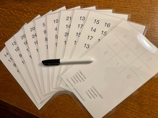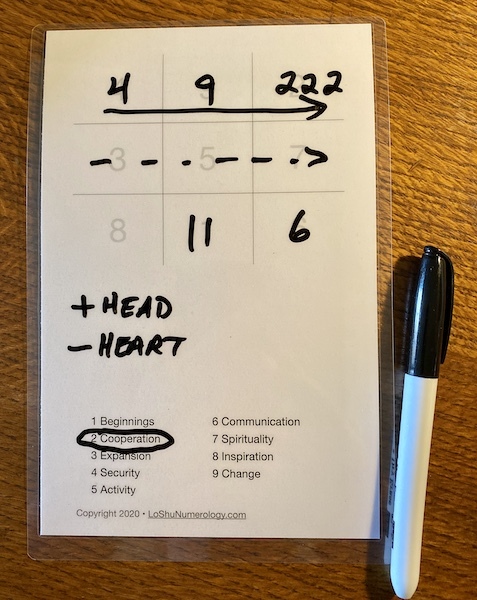 The PDF allows you to print nine cards (9″x6″), plus a tenth card that can be used for a “normal” Lo Shu reading or to use as the “kicker ending.” Laminate the cards and reuse with a fine-point dry-erase marker, or use plain paper and give away the grid after the reading. Then just print another of that grid.